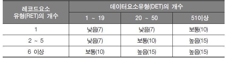 - 내부논리파일(ILF)과 외부연계파일(EIF) 각각에 대해 데이터요소유형(DET)과 레코드요소유형(RET)을 식별하여 기능 복잡도에 따라 가중치를 결정